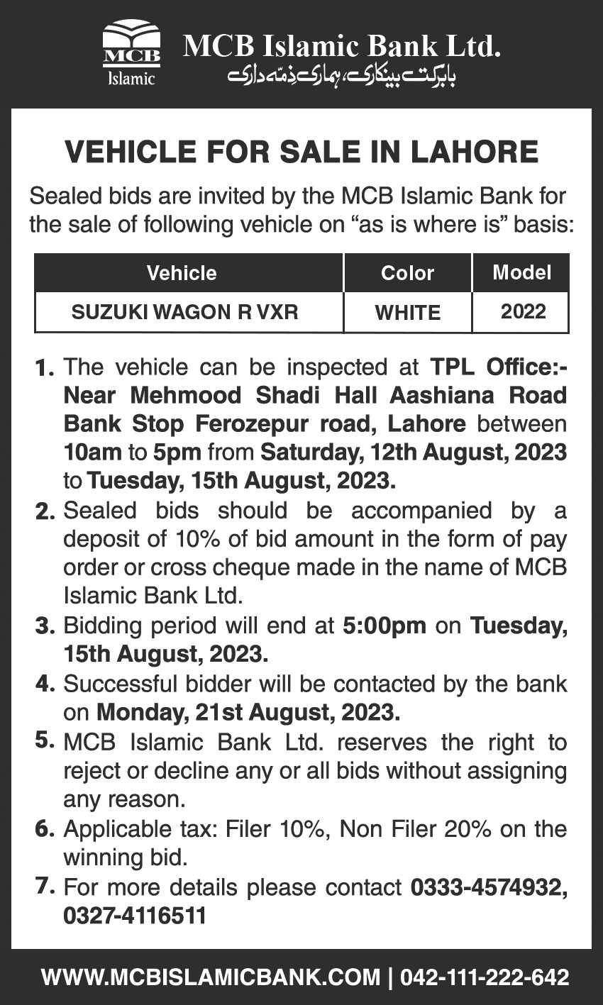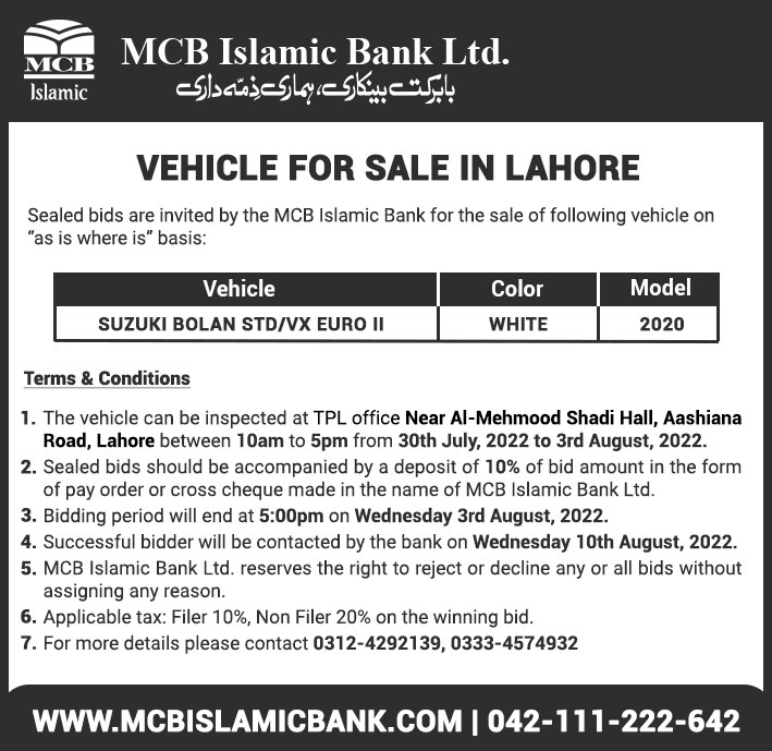 Auction Ad – Vehicle for Sale in Lahore (July 30, 2022)