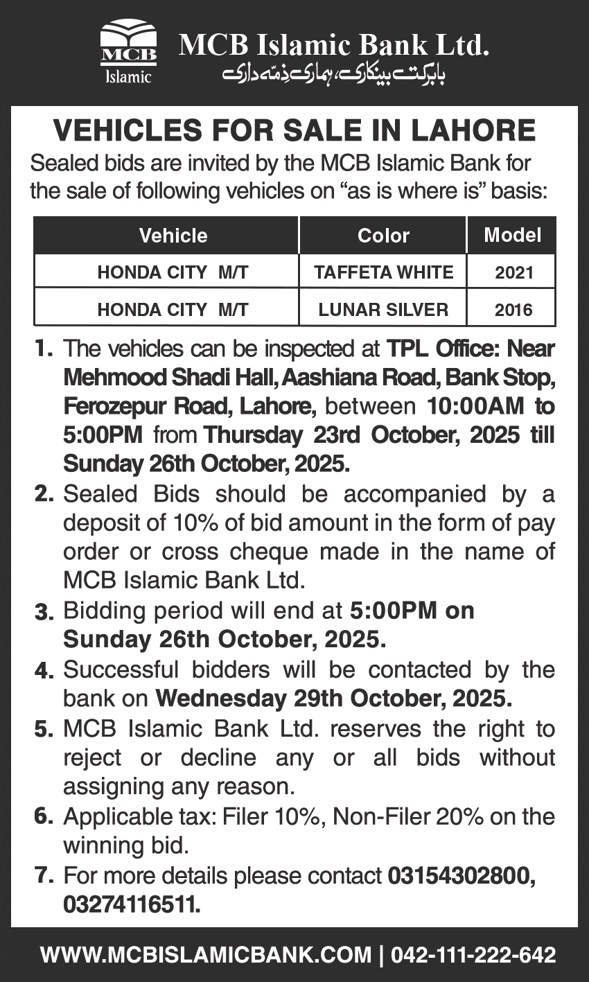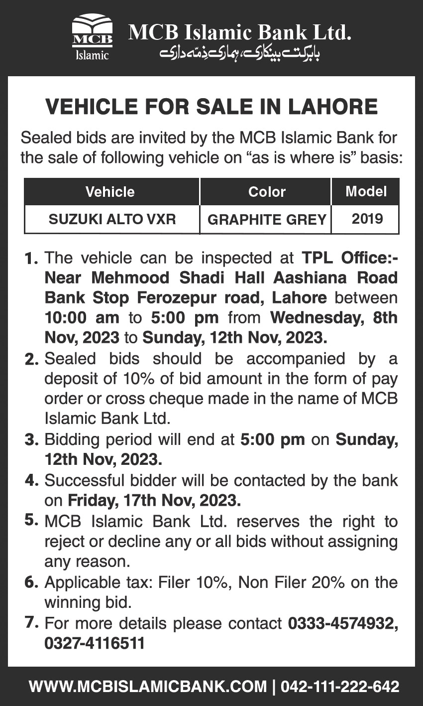 Auction Ad – Vehicle for Sale in Lahore (October 10, 2021)