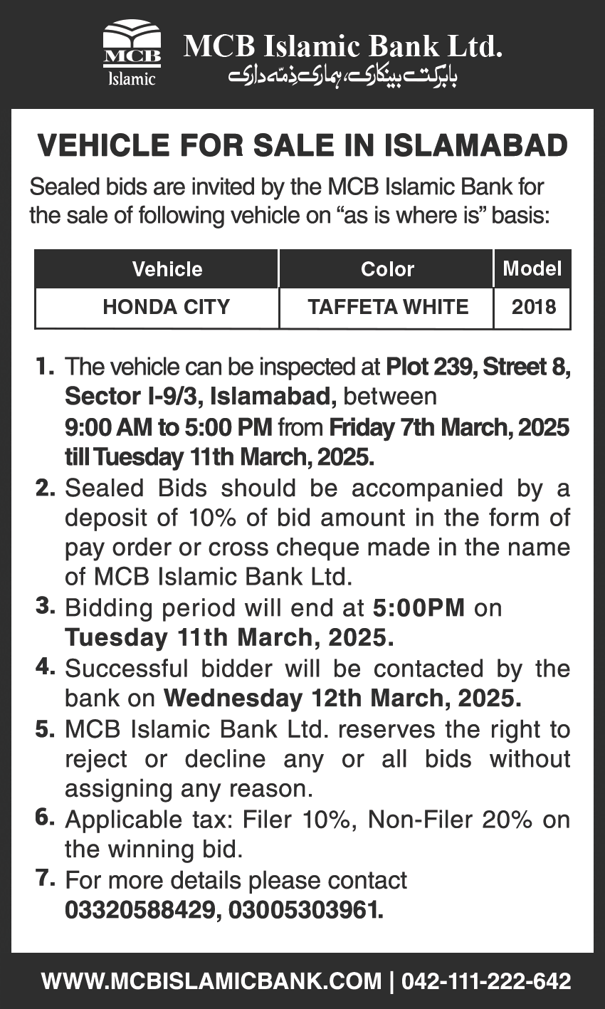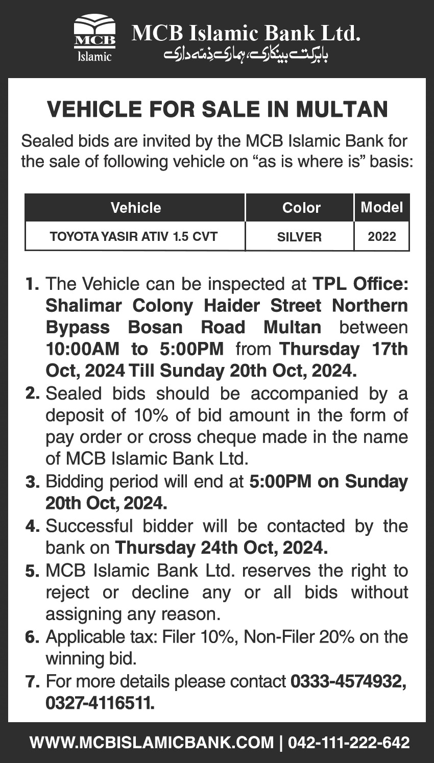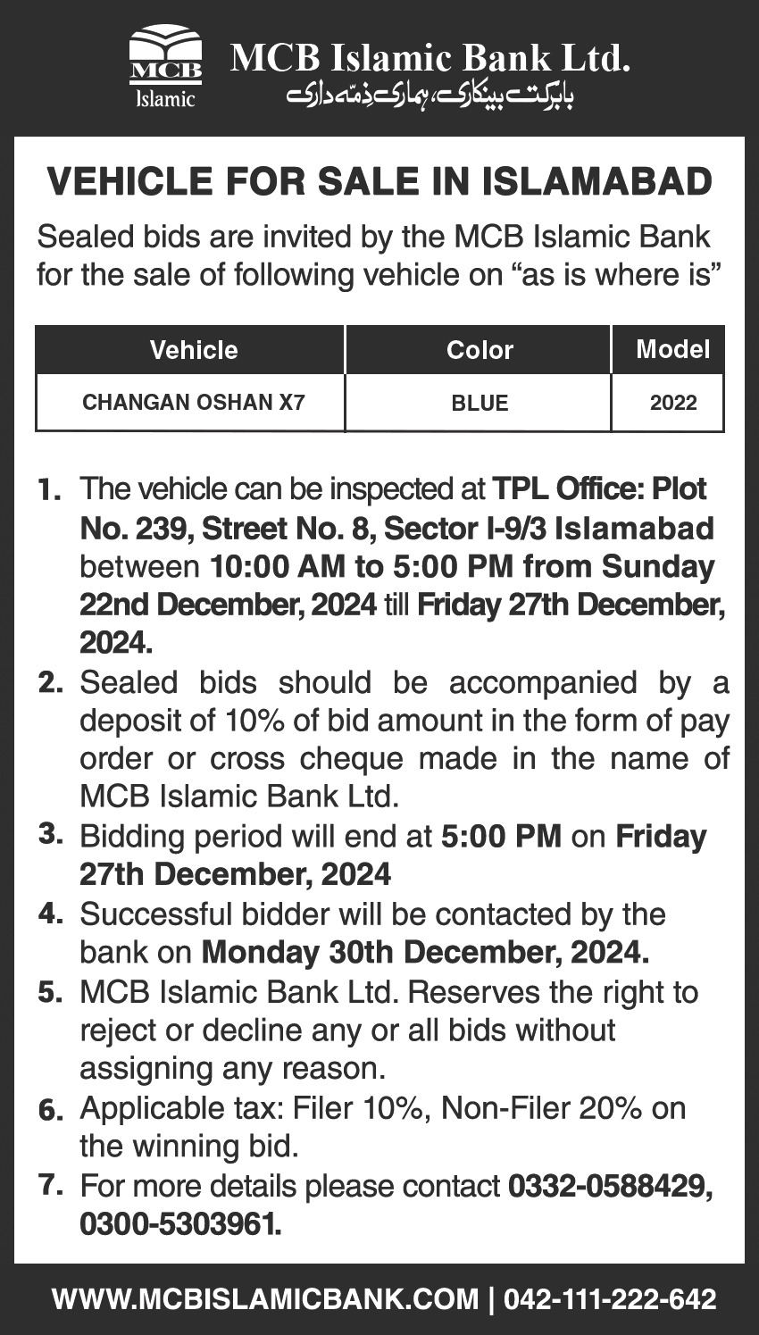 Auction Ad – Vehicle for sale in Islamabad (October 7, 2024)