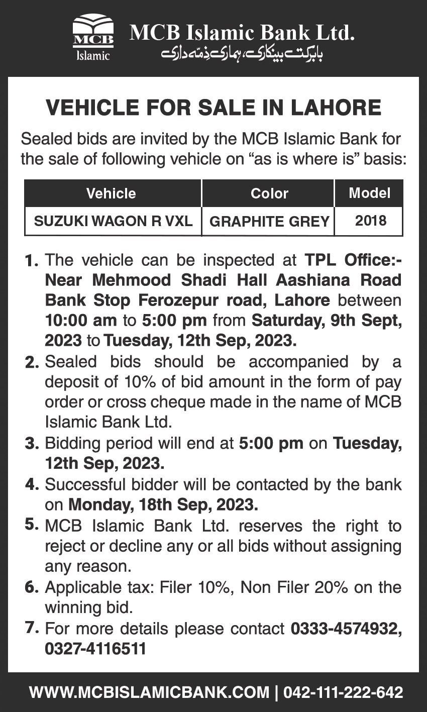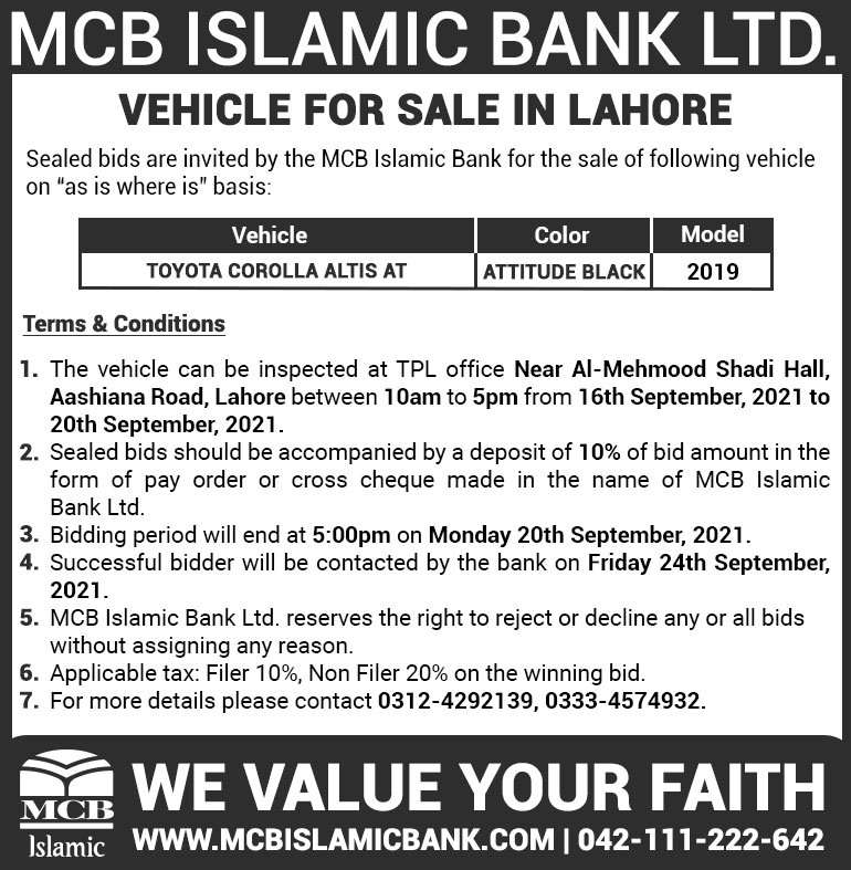 Auction Ad – Vehicle for Sale in Lahore (September 16, 2021)