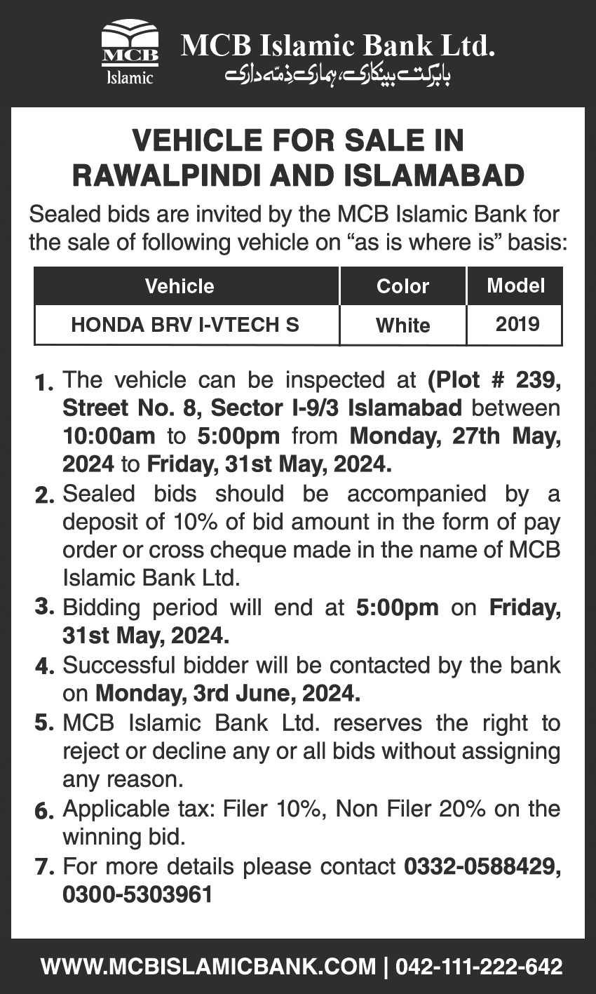 Auction Ad – Vehicle for sale in Islamabad – Rawalpindi (May 26th , 2024)