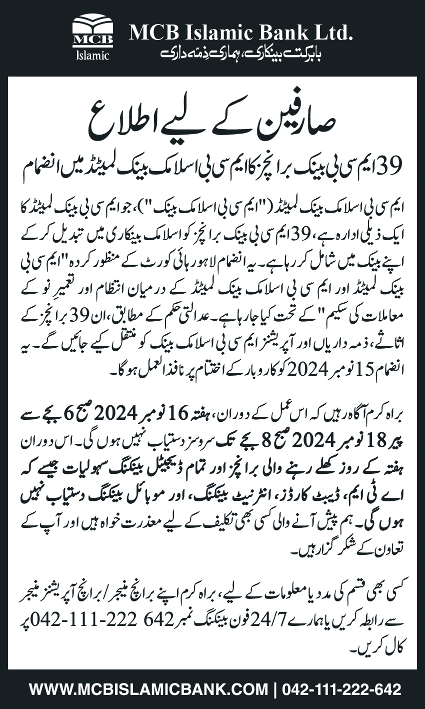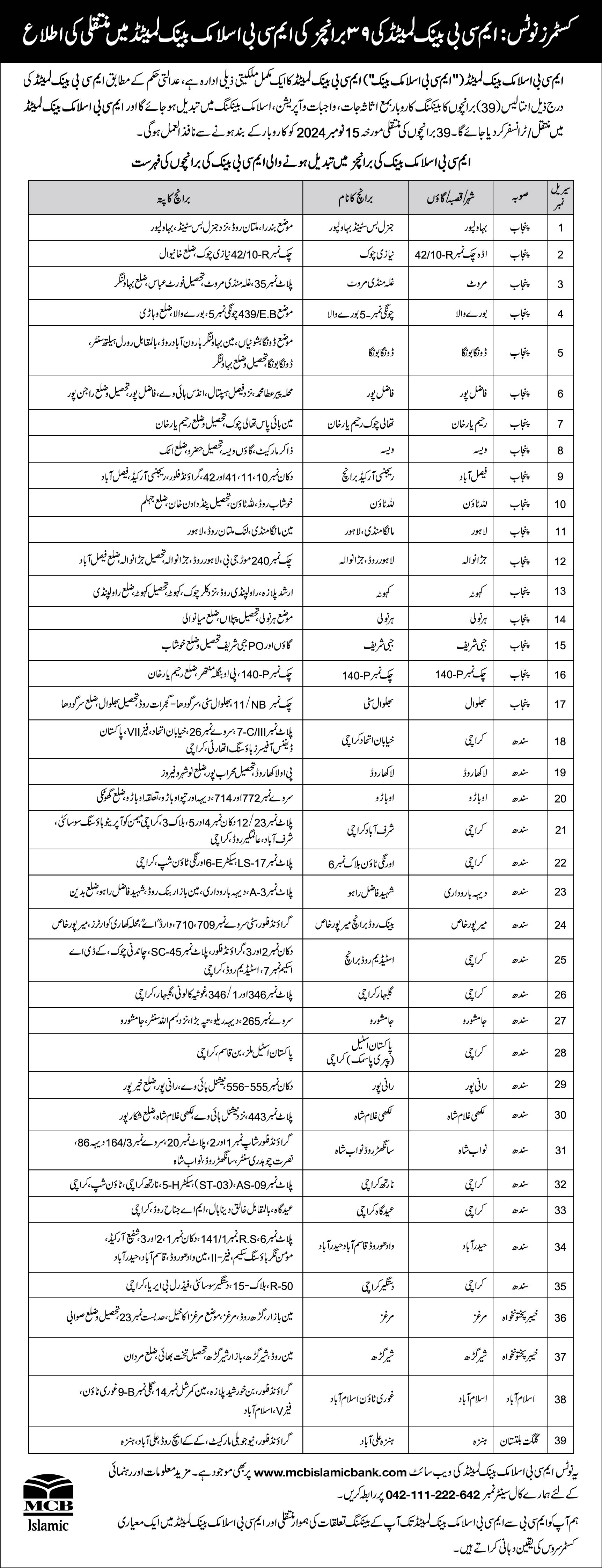 Merger of MCB BANK 39 Branches into MCB Islamic Bank (November 1, 2024)