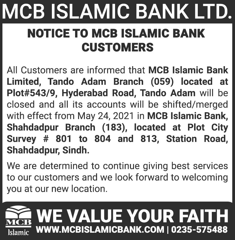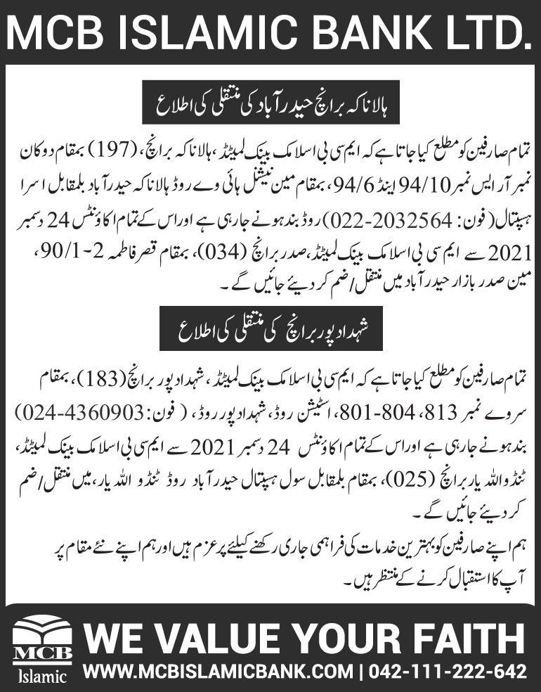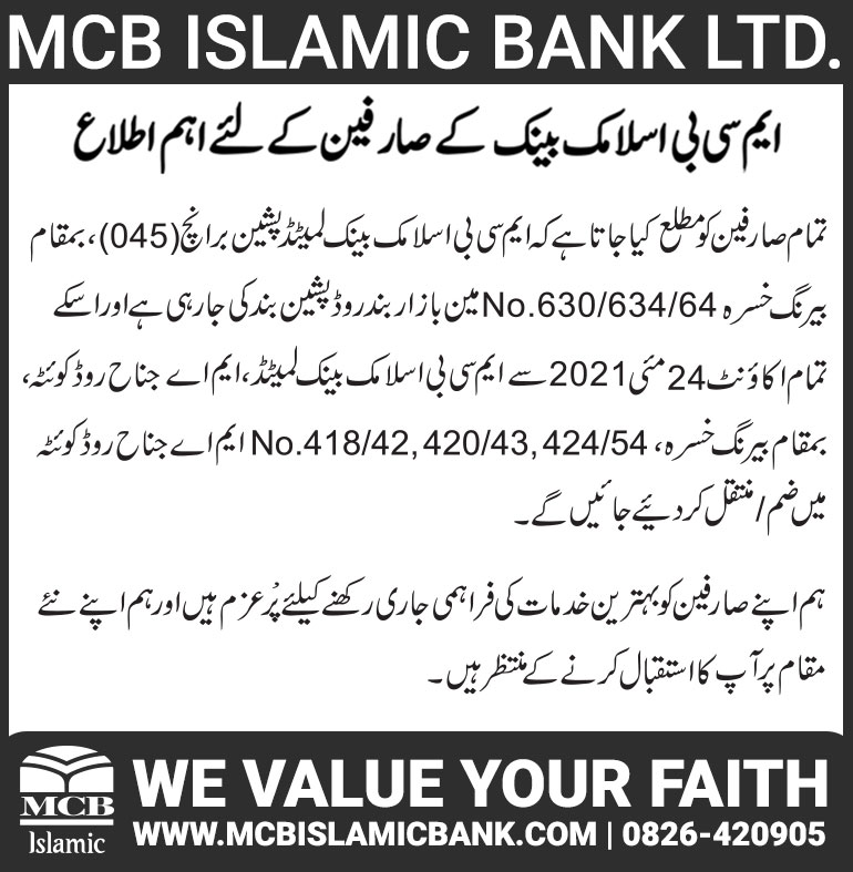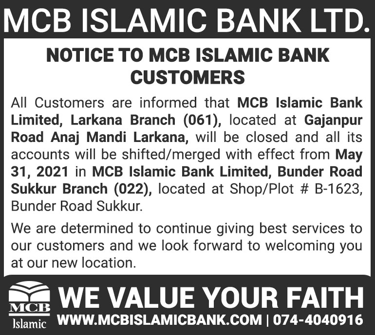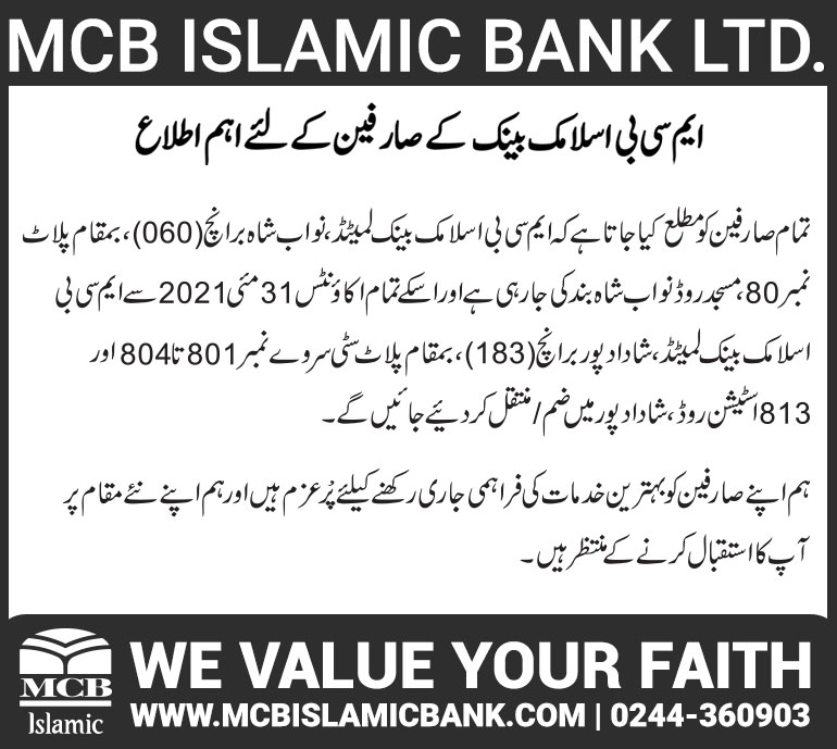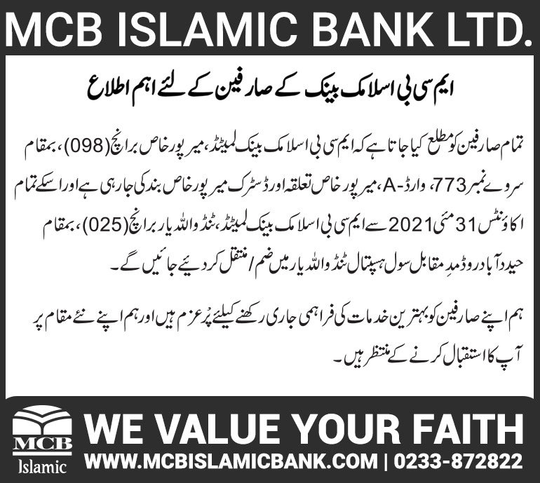 Closure of MCB Islamic Bank Shahdadpur and Halanaka, Hyderabad Branches