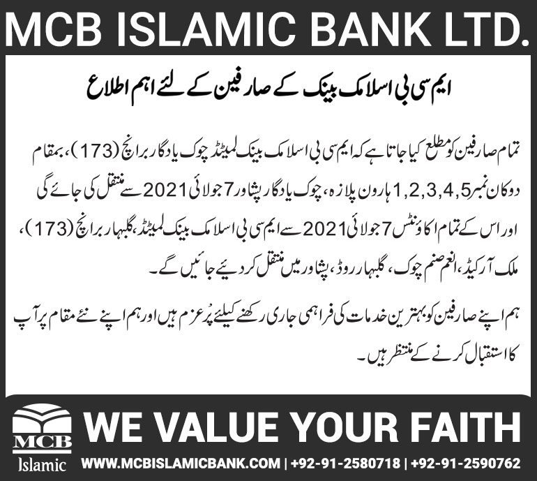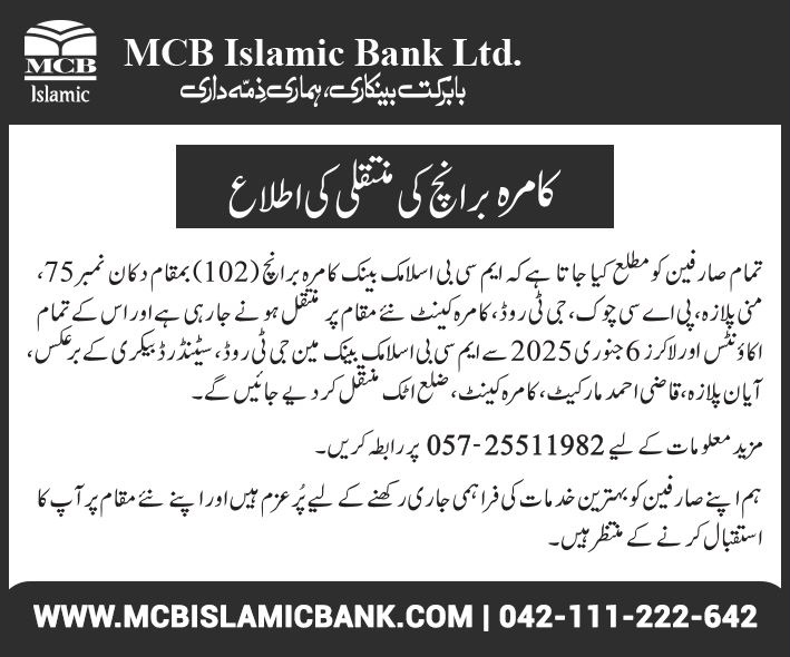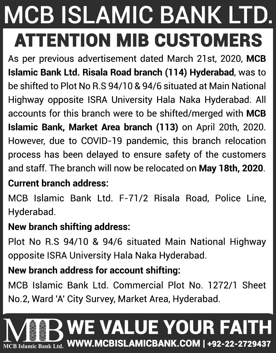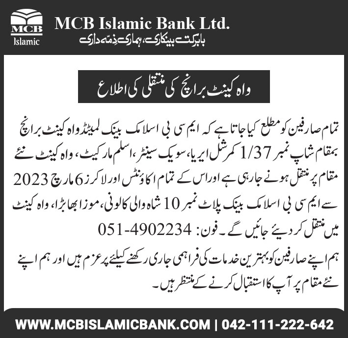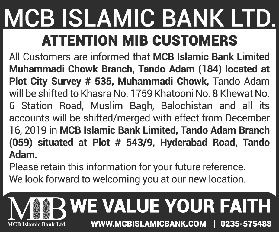 Relocation of MCB Islamic Bank Mirpurkhas Branch
