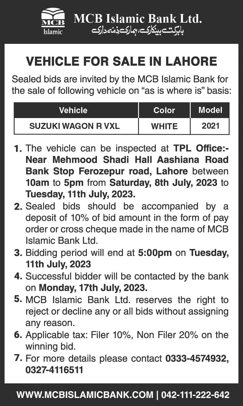 Auction Ad – Vehicle for Sale in Lahore (July 04, 2021)