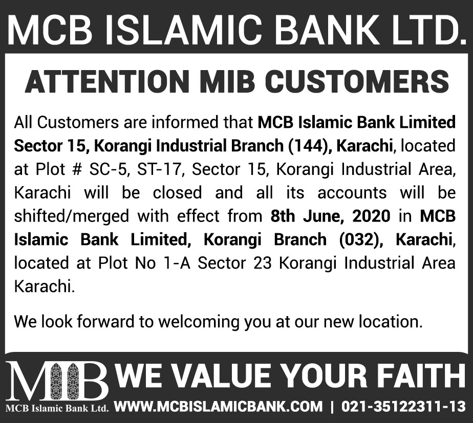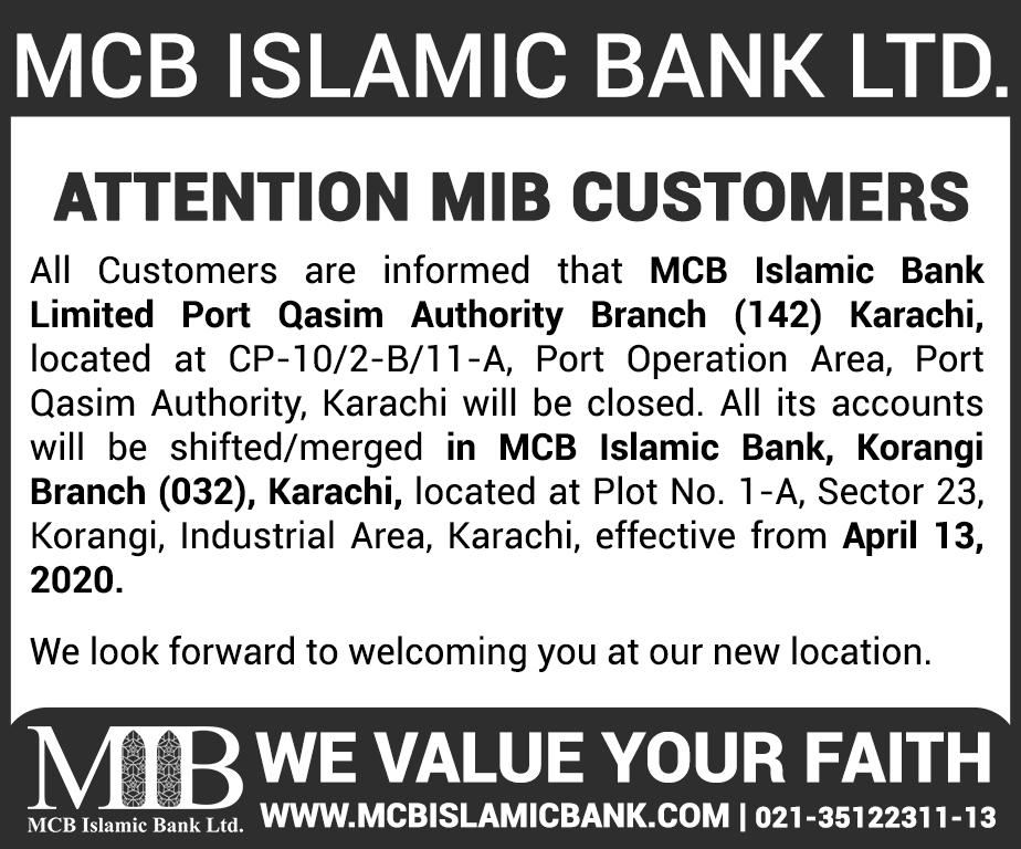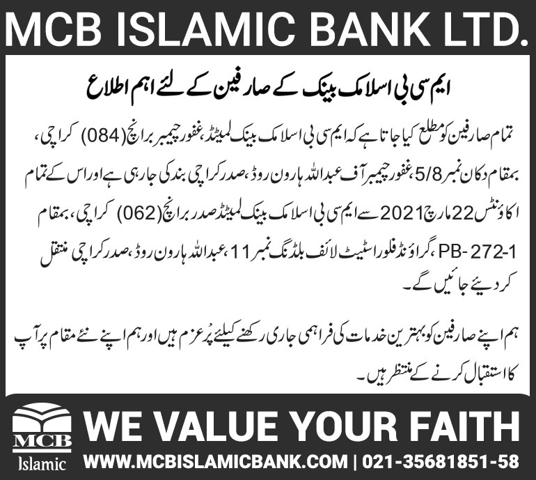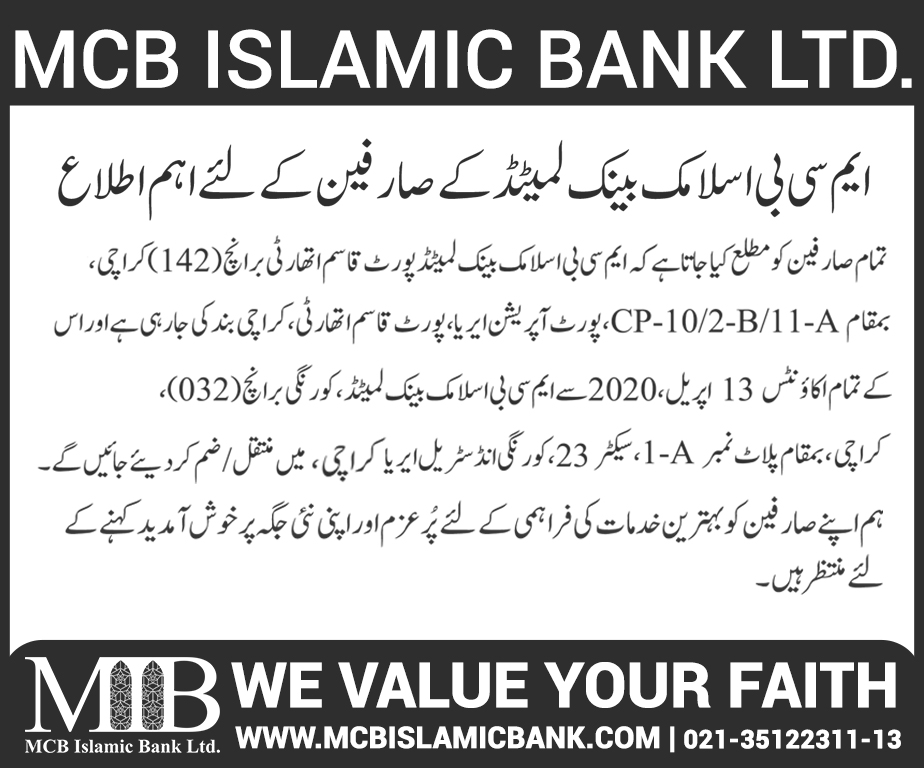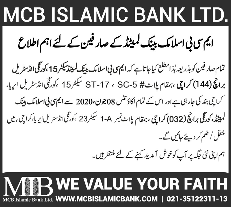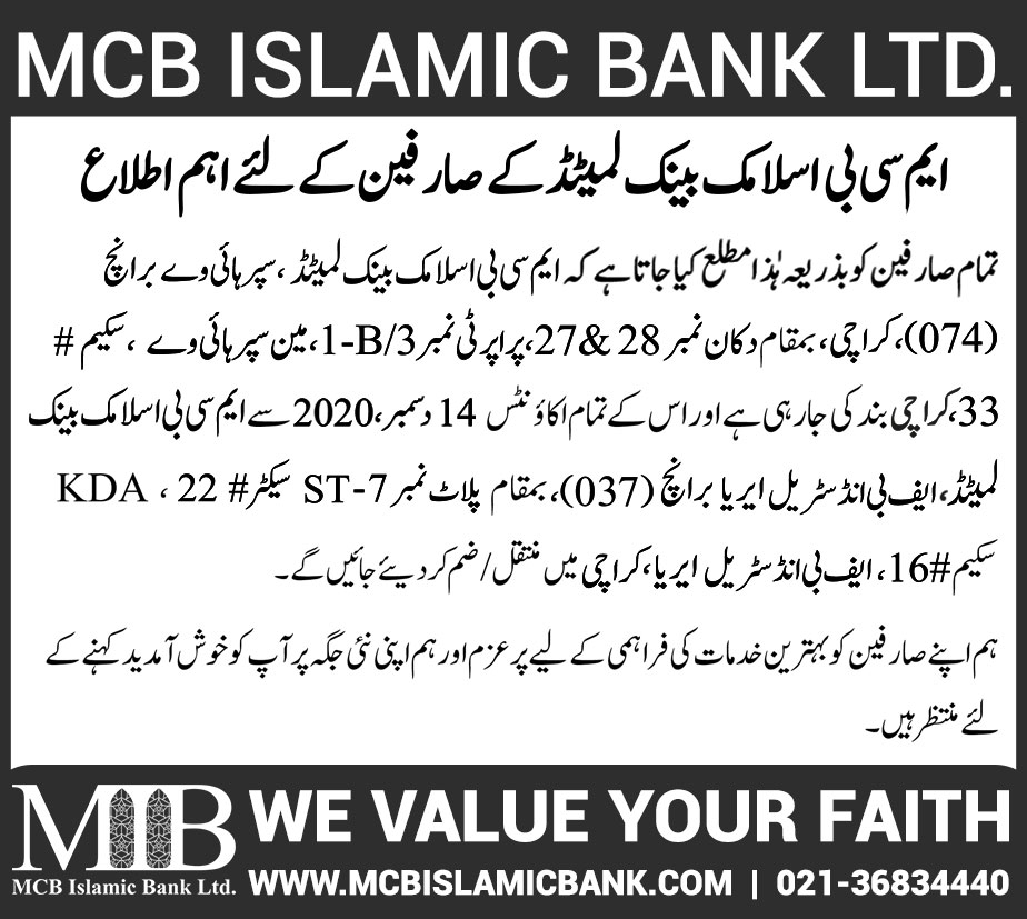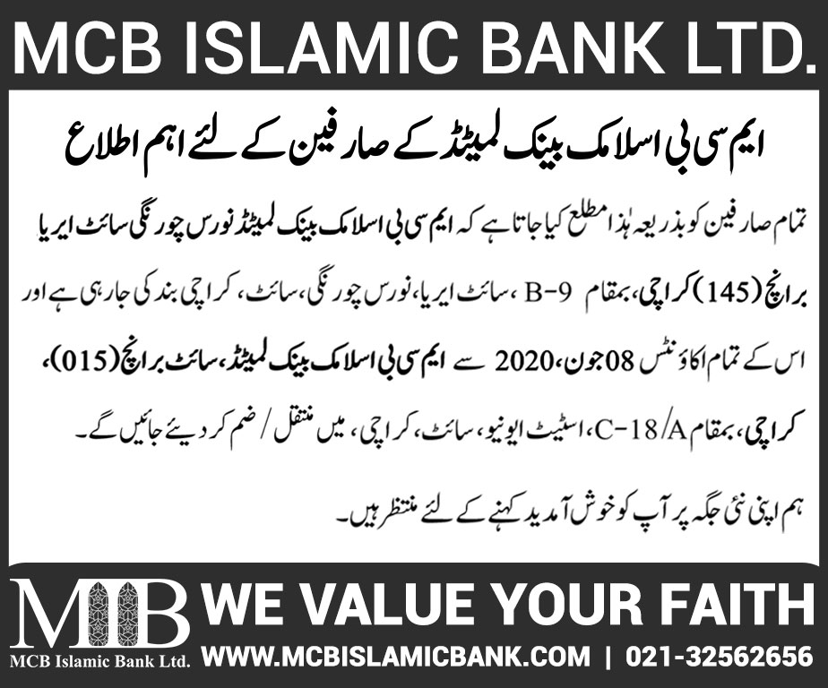 Closure of MCB Islamic Bank MATCO and West Warf, Karachi Branches