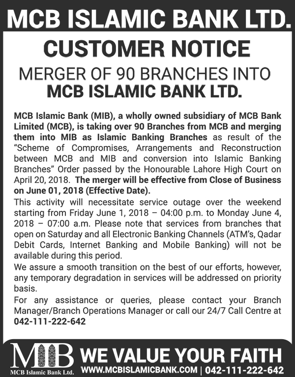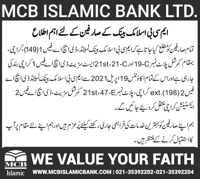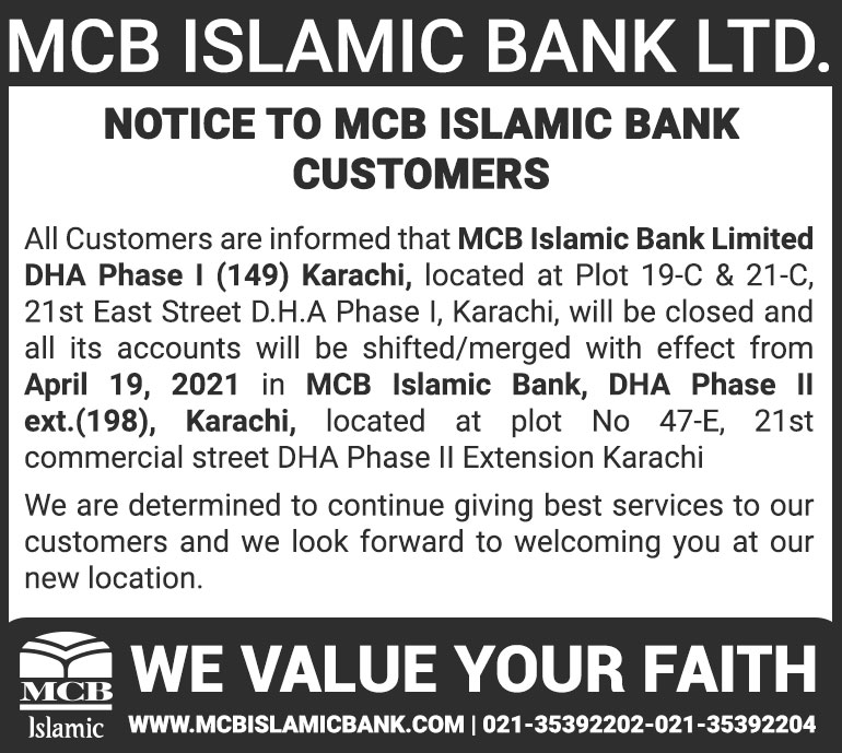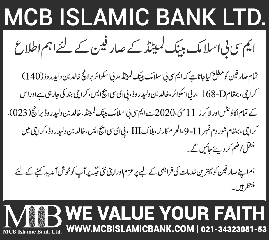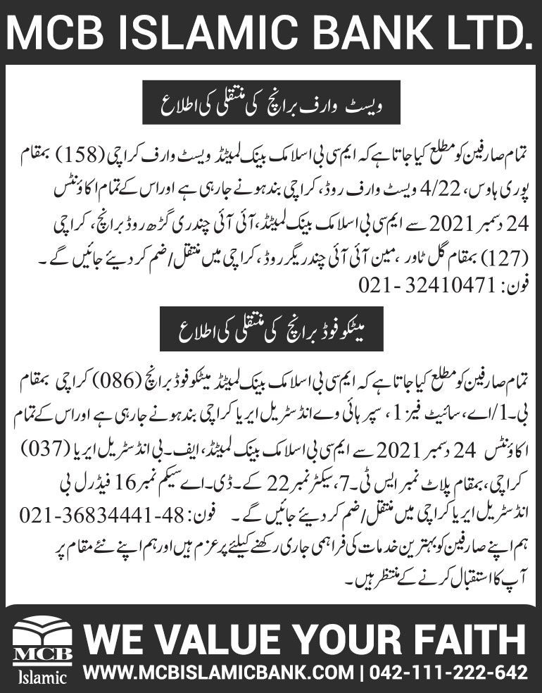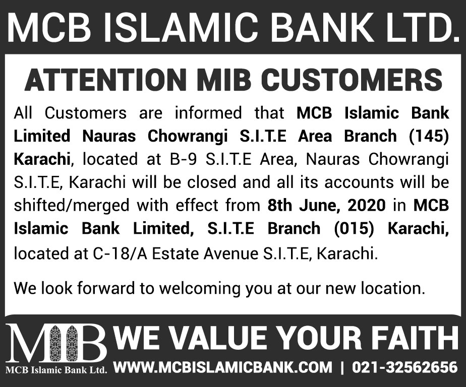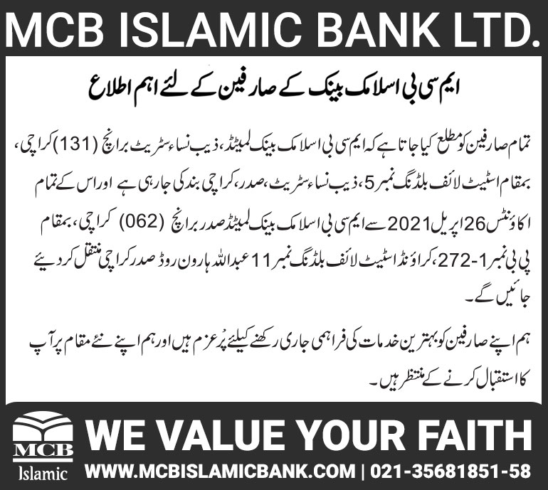 Closure of MCB Islamic Bank MATCO and West Warf, Karachi Branches