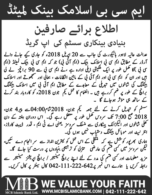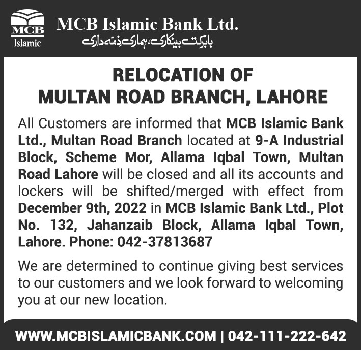 Closure of MCB Islamic Bank Multan Road Branch, Lahore