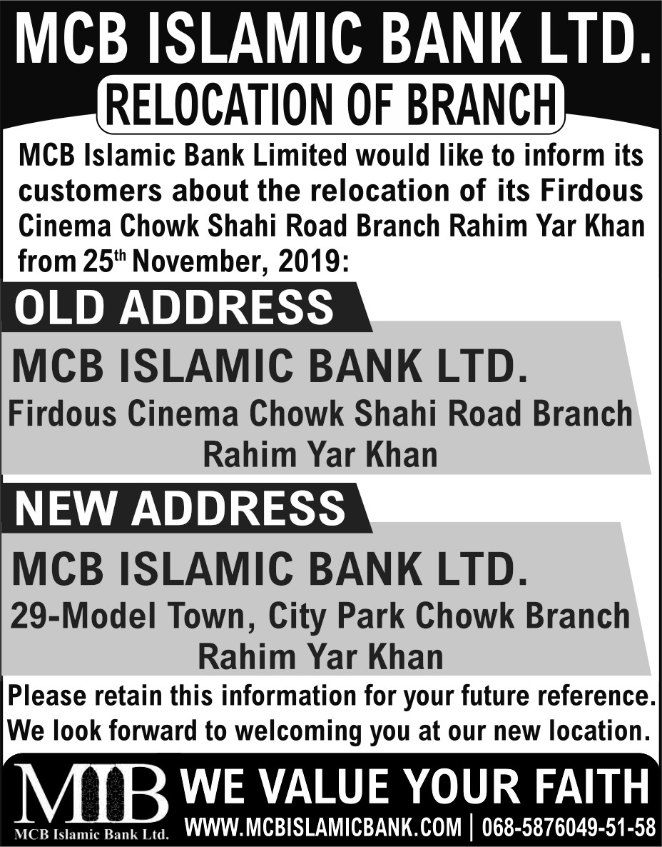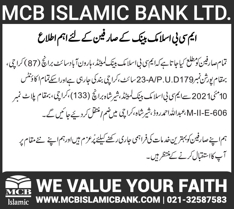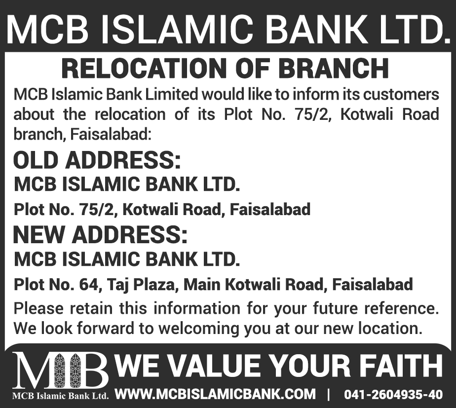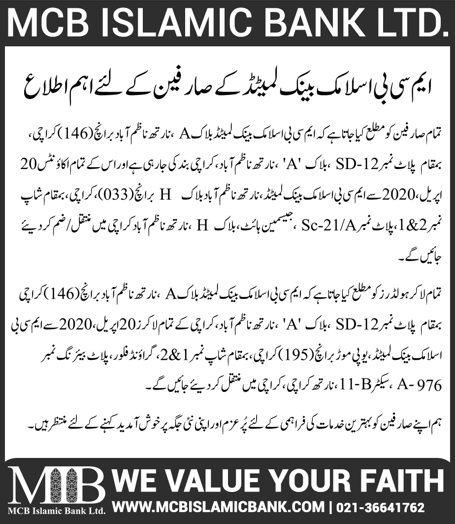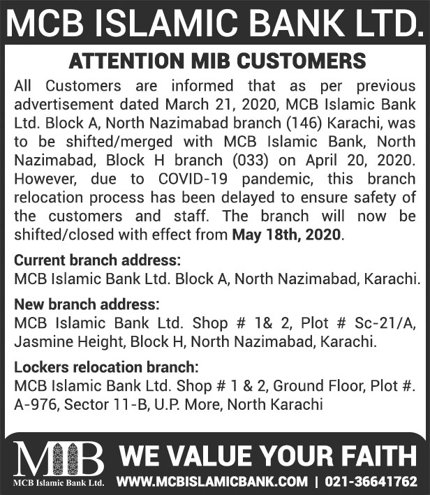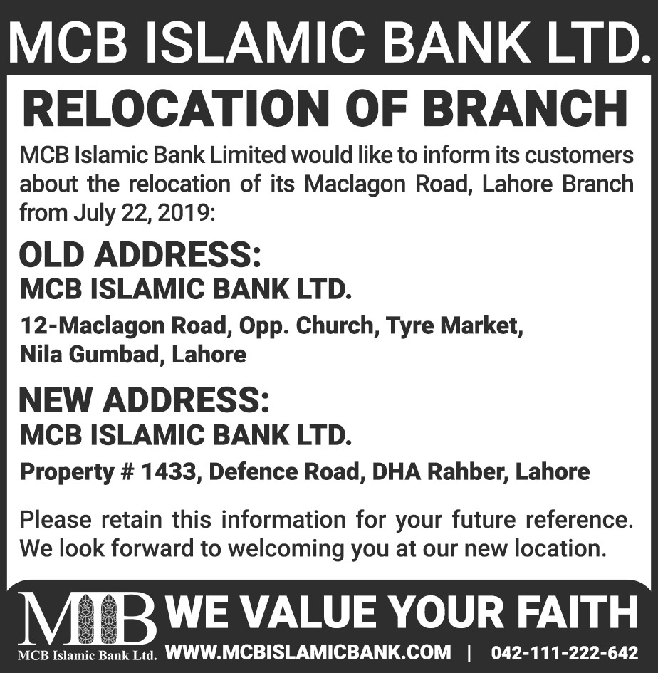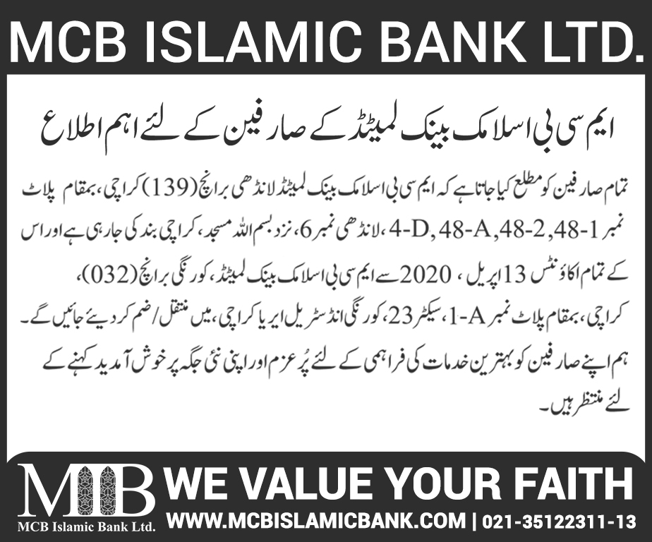 Relocation of MCB Islamic Bank Dhoraji Branch Karachi