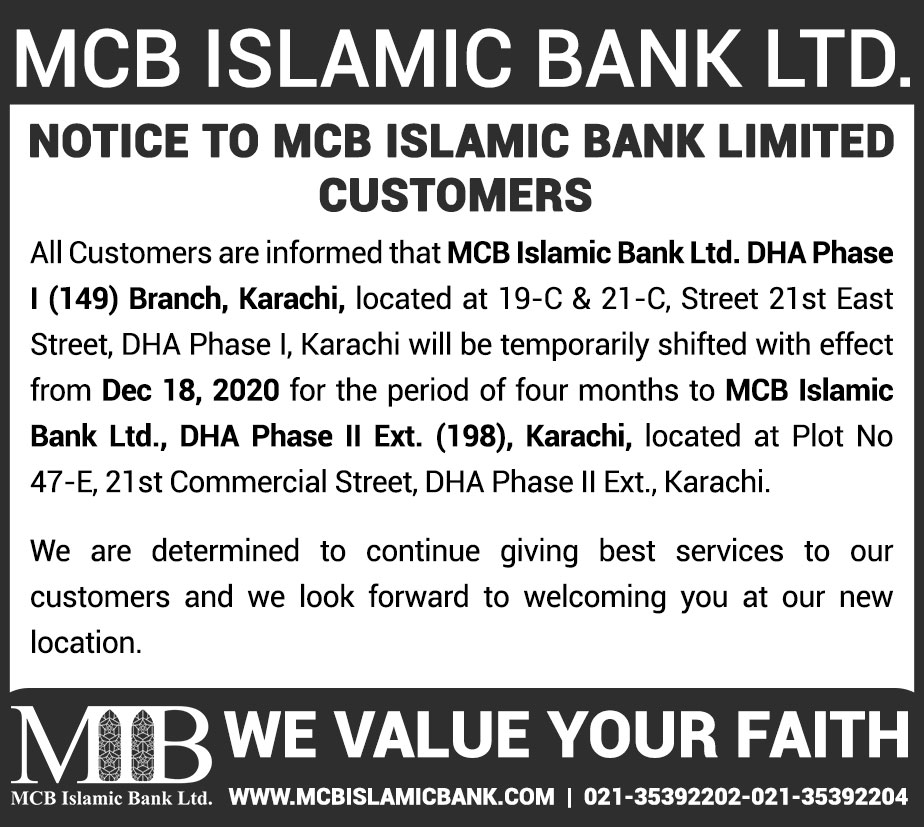 Temporary Relocation of MCB Islamic Bank DHA Phase 1 Branch, Karachi