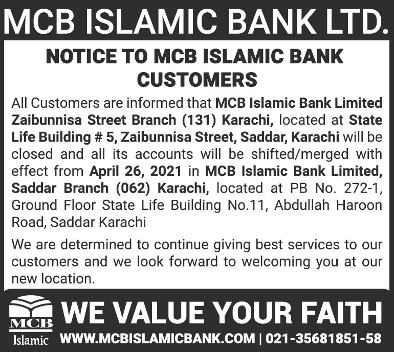 Closure of MCB Islamic Bank West Warf Branch, Karachi