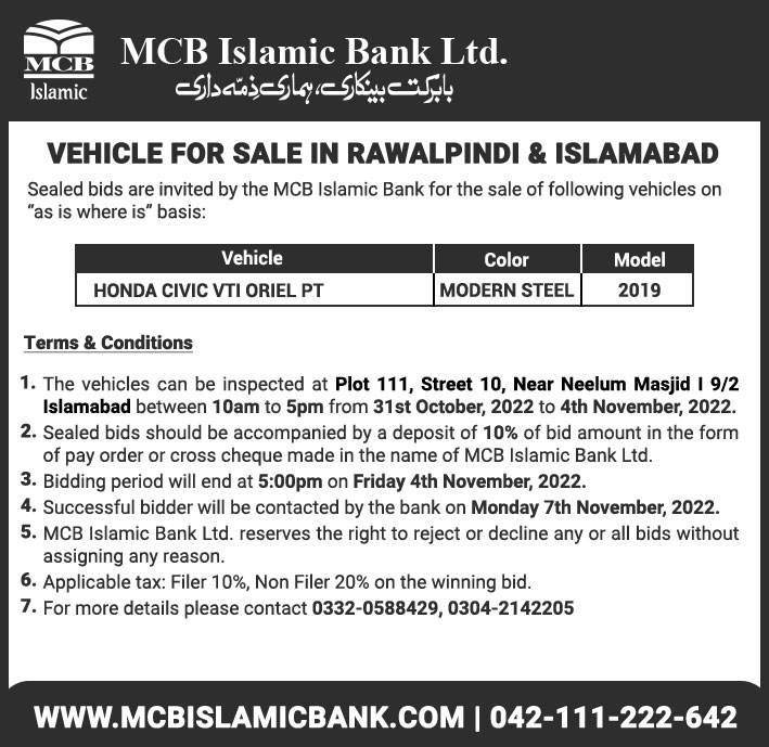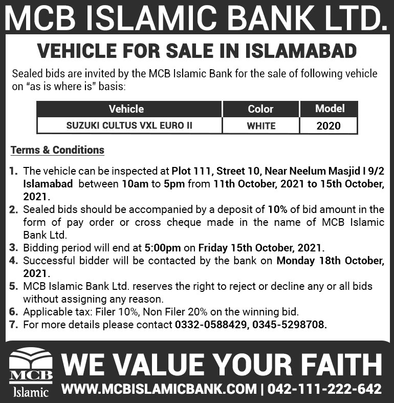 Auction Ad – Vehicle for Sale in Islamabad (October 10, 2021)