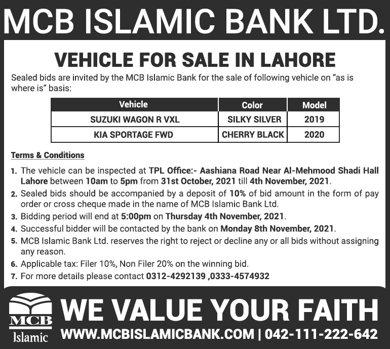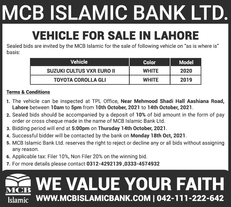 Auction Ad – Vehicle for Sale in Lahore (October 03, 2021)