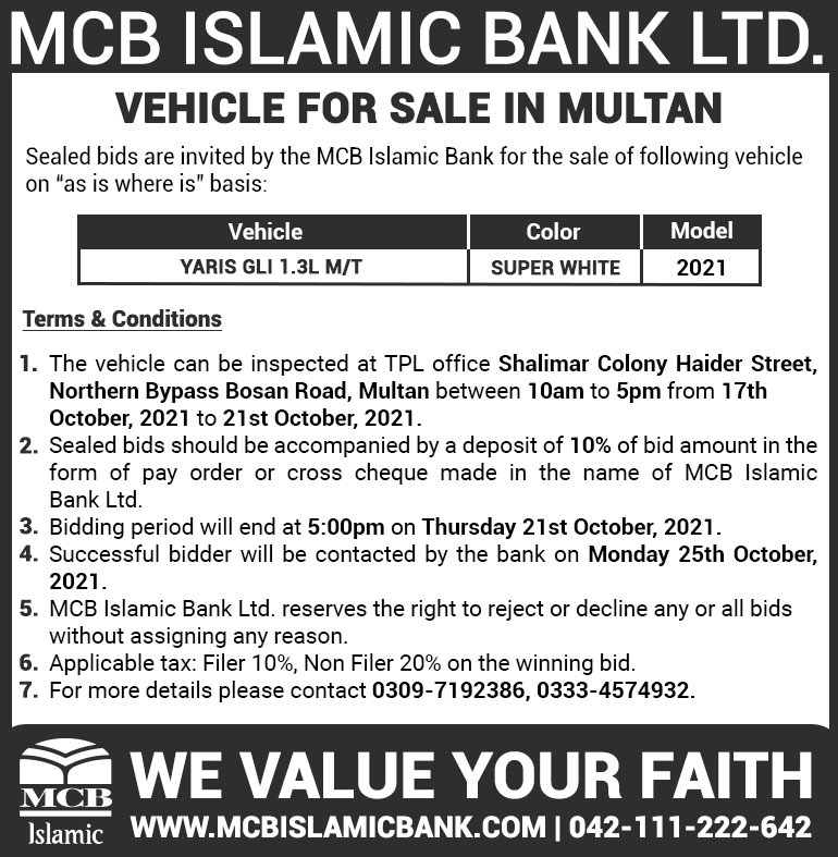 Auction Ad – Vehicle for Sale in Multan (October 17, 2021)