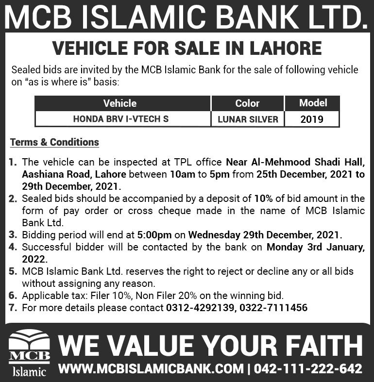 Auction Ad – Vehicle for Sale in Lahore (December 25, 2021)