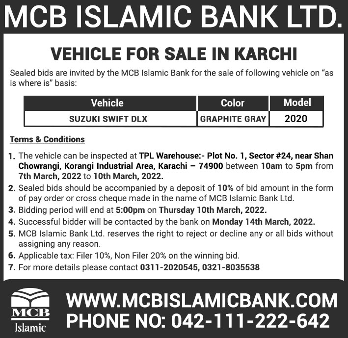 Auction Ad – Vehicle for Sale in Karachi (March 06, 2022)
